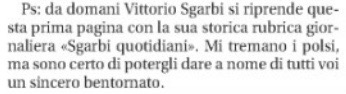 A interrompere o disturbare questa caccia al segreto è intervenuto l’annuncio, domenica scorsa, da parte del direttore del Giornale della famiglia Berlusconi, Alessandro Sallusti, del ritorno quotidiano di Sgarbi sulla prima pagina con la sua storica rubrica degli sgarbi, appunto. E così è avvenuto il giorno dopo con un lungo corsivo del critico d’arte contro una legge particolarmente indigesta al centrodestra: quella del cosiddetto ius soli, ma molto cosiddetto perché non c’è in quel progetto niente di automatico nel conferimento della cittadinanza a chi nasce in Italia da immigrati. Il giorno ancora successivo è toccato alla difesa, invece, di un coppedè romano demolito in via Ticino 3.
