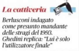 La ciliegina sulla torta dei contributi di Travaglio alle indagini di Firenze è costituita dalla “cattiveria” di giornata, come si chiama una rubrichetta di prima pagina del Fatto Quotidiano che vorrebbe conciliare la pancia col cervello. Eccola la “cattiveria” della festa di Ognissanti: “Berlusconi indagato come presunto mandante delle stragi del 1993. Ghedini replica: “lui è solo l’utilizzatore finale”. Come l’avvocato di Berlusconi disse dei rapporti del suo cliente con le donne che gli portava a casa un amico di Bari. Le bombe, insomma, come le mignotte, dicono a Roma.