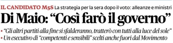 Per quanto sfaldati, sciolti, annegati e quant’altro, il buon Di Maio si sente già all’opera “con tutti” per “trattare alla luce del sole” l’appoggio di cui sfortunatamente il suo governo avrà bisogno in Parlamento per ottenere la fiducia richiesta dalla Costituzione, avendo ottenuto il suo partito più voti degli altri, presi singolarmente, ma non la maggioranza assoluta dei seggi alla Camera e al Senato, per quanto lui preveda di “triplicare” la rappresentanza parlamentare a 5 stelle.