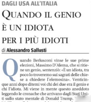 Italiano al cubo, tanto da essere scambiato qualche volta per un razzista più che per un patriota, e in più direttore del Giornale della famiglia Berlusconi, fondato da Indro Montanelli nel lontano 1974 senza immaginare –credo- di poterlo perdere in meno di vent’anni, Alessandro Sallusti ha pensato pure lui al suo editore quando ha letto l’autocelebrazione di Trump. E lo ha scritto con sincerità e trasparenza tornando a rimproverare dopo più di 25 anni a Massimo D’Alema una profezia quanto meno avventata, e più volte smentita dall’interessato senza convincere evidentemente più di tanto Sallusti. Che gli ha nuovamente attribuito la qualifica di Berlusconi come di “un idiota che troveremo sui sagrati delle Chiese a chiedere l’elemosina”.