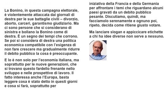 Aspetta, non te ne andare. Chissà quando mi toccherà di risognarti. Dammi un consiglio su chi votare il 4 marzo. “Diavolo, me lo chiedi pure. Devi votare per Emma Bonino, che sarà pure stata radicale ma mi ricorda tanto, per come si veste e come parla degli immigrati e del dovere di accoglierli sempre e comunque, una specie di Madre Teresa di Calcutta laica. E figurati se io, da buon cristiano, non le darei una mano”.