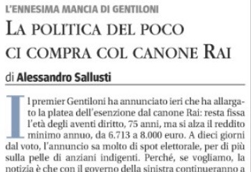 Un petardo, per esempio, è quello che ha appena acceso, fra gli altri, il direttore del giornale di famiglia di Silvio Berlusconi cercando di amplificare con un editoriale le bordate delle opposizioni a corto di argomenti contro una mancia elettorale attribuita al presidente del Consiglio Paolo Gentiloni. Cha ha deciso di elevare –sentite di quanto- da 6.713 a 8000 euro l’anno la soglia di reddito entro cui contenere il diritto degli ultrasettantacinquenni all’esenzione dal canone Rai.