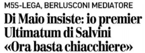 L’annuncio della mediazione di Berlusconi, tempestivo anche rispetto alle consultazioni che si apriranno il 4 aprile al Quirinale, dove forse il presidente forzista potrà riferirne al capo dello Stato sollevandolo dalle inquietudini di una crisi di governo formalmente apertasi nel buio più completo con le dimissioni di Paolo Gentiloni, è stato dato dal Quotidiano Nazionale del gruppo Monti Riffeser. Che racchiude tre testate storiche come Il Giorno, il Resto del Carlino e La Nazione, nel loro ordine geografico, dal Nord in giù.