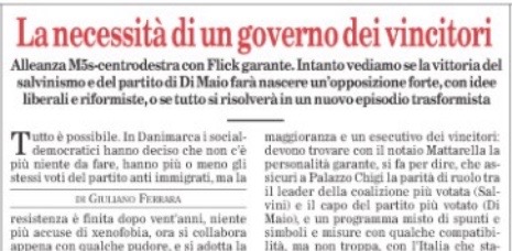 Giuliano Ferrara, che forse conosce Silvio Berlusconi meglio di ogni altro della cerchia di Arcore, anche di quelli di più antica data e frequentazione dell’ultraottantenne signore della Brianza, ha tradotto sul suo Foglio in una “alleanza M5S-centrodestra con Flick garante” a Palazzo Chigi “la necessità di un governo dei vincitori” maturata all’improvviso nella testa, ma forse anche nelle viscere, dell’ex presidente del Consiglio. E riportata dagli altri giornali ricorrendo alla formula del “sì di Berlusconi al governo con le 5 stelle”, come ha fatto Repubblica in un vistoso titolo di prima pagina. Ma La Stampa si è avventurata un po’ sulla strada del Foglio sparando l’annuncio, sempre in prima pagina, che “Di Maio e Salvini cercano un premier” di compromesso fra le loro ambizioni dirette e personali, per quanto confortate elettoralmente dal primo posto guadagnatosi dai grillini nella graduatoria dei partiti e dal sorpasso della Lega su Forza Italia.