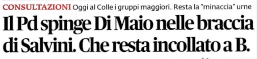 Ma il peggio è nella parte finale del titolo, dove si afferma in modo categorico e indignato che il leader leghista, per quanto premiato dagli elettori col sorpasso su Forza Italia all’interno della coalizione di centrodestra, “resta incollato a B”. Cioè a Berlusconi, contro il quale invece Di Maio pratica e reclama un ostracismo politico e morale, per quanto al Quirinale gli abbiano dato ancora dell’onorevole nel calendario delle consultazioni, alle quali l’ex presidente del Consiglio è stato convocato con le due donne promosse capigruppo parlamentari.