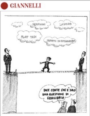 L’equilibrista che Emilio Giannelli ha raffigurato con la sua vignetta di prima pagina sul Corriere della Sera nella persona del presidente del Consiglio Giuseppe Conte, in bilico su un filo alle cui estremità lo stanno a guardare, ben saldi sulle loro rocce, i vice presidenti grillino e leghista Luigi Di Maio e Matteo Salvini, non è una forzatura satirica. E’ purtroppo una realtà politica, cui però Giannelli ha forse sbagliato a considerare estranei, scambiandoli per i soli controllori di Conte, i leader dei due movimenti che fanno parte del governo. Sono anch’essi degli equilibristi, che si illudono di stare sicuri e solidi sulle loro postazioni, come li ha appunto rappresentati il vignettista del Corriere.