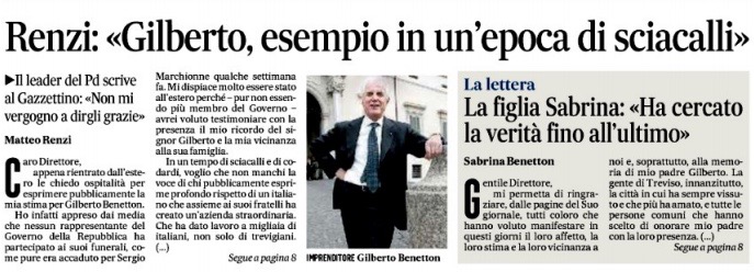 La politica nazionale è stata riscattata dal senatore Matteo Renzi, ex presidente del Consiglio ed ex segretario del Pd, con una lettera al Gazzettino, il quotidiano del NordEst, come si vanta di essere la testata: una lettera di “profondo rispetto” per Gilberto Benetton e tutta la sua famiglia “in un tempo di sciacalli e di codardi”. E’ il rispetto dovuto a chi “ha dato lavoro a migliaia di italiani, e non solo trevigiani” creando e sviluppando “un’azienda straordinaria”, nota con i suoi colori e le sue multiformi attività in tutto il mondo.