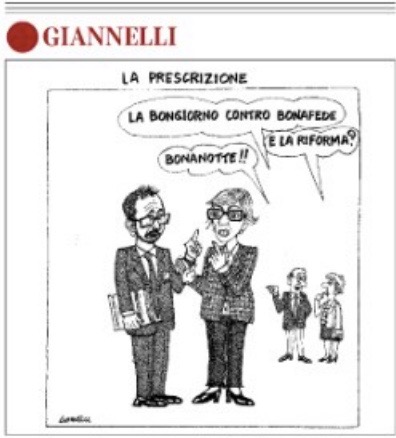 Con questo precedente professionale, par di capire, l’avvocato e ministro Bongiorno non avrebbe quindi titolo ad occuparsi dell’iniziativa assunta dal suo collega Bonafede. E buona notte, come fa dire Giannelli a un attore della sua vignetta di prima pagina del Corriere della Sera.