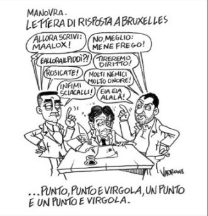 Vauro Senesi è riuscito sul Fatto Quotidiano a rappresentare come meglio non si poteva la notizia rimbalzata per tutta la giornata sulle misteriose ragioni per le quali il presidente del Consiglio, peraltro in partenza per Palermo alle prese con un’altra grana come quella della Libia, non riusciva a riunire attorno allo stesso tavolo i due vice e altri interessati alla famosa lettera di risposta ai commissari europei. Che l’attendono per trasformare il loro dubbi sui conti del bilancio italiano del 2019 in una procedura d’infrazione.