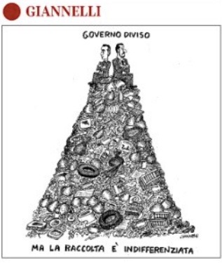 Quello che Giannelli ha disegnato è un cumulo di rifiuti su cui troneggiano i due vice presidenti del Consiglio, lo stesso Di Maio e il leghista Matteo Salvini, divisi su cosa farne, o come trattarli. Se destinarli all’inceneritore più vicino, almeno uno in ogni provincia, estendendo dappertutto i buoni affari che fanno quelli operanti dove gli amministratori hanno avuto la fortuna, l’accortezza, il coraggio, come preferite, di lasciarli costruire e funzionare, o mangiarseli.