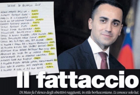Non basterebbe a Di Maio neppure tutta la disinvoltura dimostrata prima e dopo l’indubbio successo elettorale del 4 marzo scorso – e ciò che ne è conseguito a livello politico e persino istituzionale, con un Parlamento costretto a votare a scatola chiusa, e con tanto di fiducia, varie e contraddittorie edizioni della manovra finanziaria e del bilancio- per negare “il fattaccio” contestatogli dal manifesto con un fotomontaggio che lo propone accanto alla lista delle cose promesse e già realizzate.