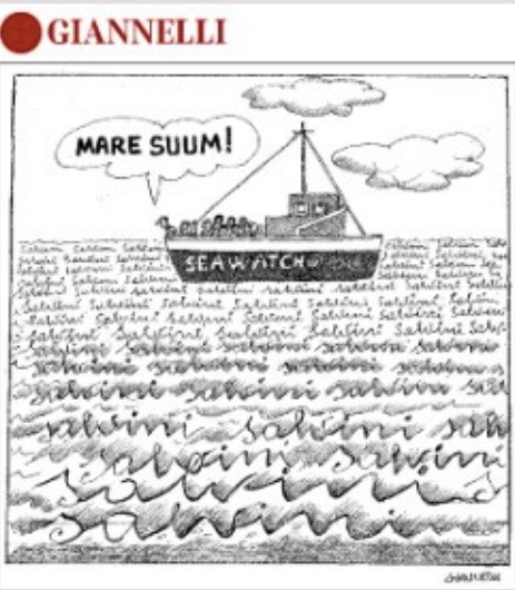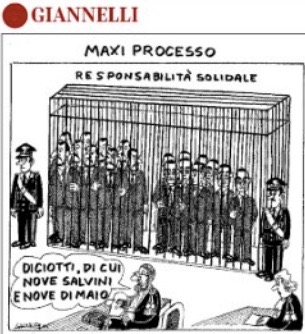 destra di Giorgia Meloni a sostenere Salvini e i piddini di ogni tendenza a cavalcare invece la vicenda giudiziaria contro il ministro dell’Interno- ha naturalmente scatenato la fantasia generalmente brillante dei vignettisti e dei titolisti delle prime pagine. Brillante, però, con una eccezione almeno a mio parere: quella di Mauro Biani, che sul manifesto si è lasciato prendere la mano dall’antisalvinismo ed ha in qualche modo paragonato il processo al ministro dell’Interno a quello di Norimberga contro i boia nazisti.
