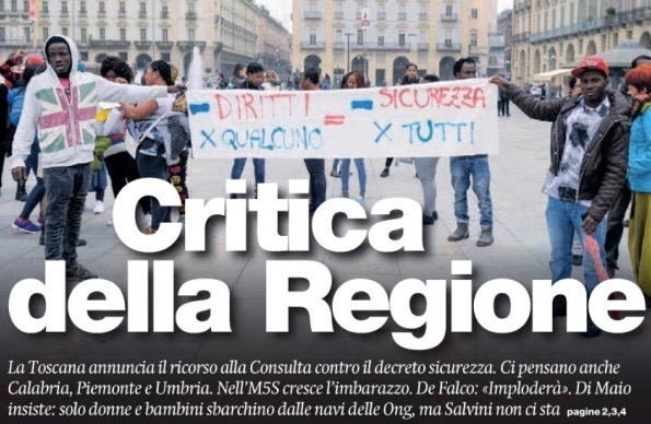E’ a dir poco curiosa la solitudine nella quale i cosiddetti giornaloni, che poi si lamentano delle copie che perdono, hanno lasciato il manifesto -che non per questo tuttavia farà questa volta il pieno nelle edicole- con l’annuncio vistoso, in prima pagina, dei ricorsi regionali in arrivo alla Corte Costituzionale contro le norme della nuova legge su sicurezza e immigrazione. Che sono contestate a voce alta da un bel pò di sindaci di città importanti come Palermo, Napoli, Parma, e meno alta ma ugualmente avvertibile da sindaci ed altri amministratori locali di militanza grillina, forzista e persino leghista, del partito cioè dello stesso Salvini.
