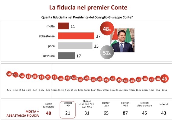 “per caso o solo di facciata”, un istituto dei sondaggi fra i maggiori -SWG- ha smascherato romanzieri, favolisti, pittori di corte e simili. Ed ha rivelato che dal 4 giugno scorso al successivo 15 luglio, cioè fra la vittoria elettorale di Salvini alle elezioni europee di fine maggio alla decantata esplosione di popolarità e di prestigio di Conte, quest’ultimo è passato da una fiducia del 58 ad una fiducia del 48 per cento del pubblico. Dieci punti in meno in un mese non mi sembrano francamente pochi, per quanto il 48 per cento -lo ammetto, per carità- sia di tutto rispetto.