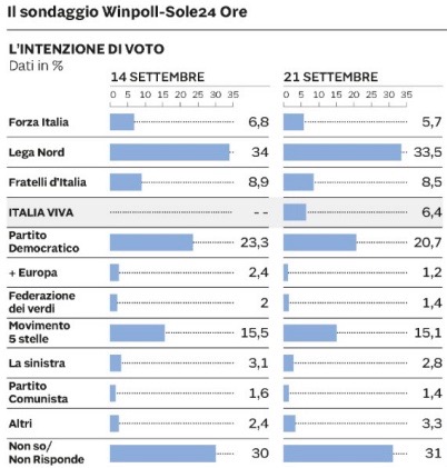è già stata esclusa la sua partecipazione ai prossimi rinnovi delle amministrazioni regionali, risulta provenire per l’1,8 per cento dalla formazione +Europa di Emma Bonino e Bruno Tabacci, peraltro in crisi per l’opposto atteggiamento assunto dai due in Parlamento: l’una negando e l’altro accordando la fiducia al secondo governo di Giuseppe Conte. Per l’1,6 per cento l’area d’interesse per Renzi proviene dal Pd e per l’1,5 da Forza Italia, alla quale però basta e avanza questo per ritrovarsi sotto Italia viva nella graduatoria dei partiti.