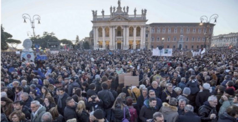 di “tutti, da Leu a Fratelli d’Italia”, non guidato da Giuseppe Conte, neppure nella versione “Figo” sarcasticamente esposta sulla prima pagina dal Tempo, ma magari da quel “disoccupato” provvidenziale e di lusso che è Mario Draghi; per quanto spiazzate da tutto questo, dicevo, le sardine italiane radunatesi nella piazza romana di San Giovanni si sono riproposte nella versione emergenziale contro la destra incombente sul Paese.