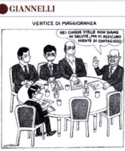 E’ letteralmente impagabile quel reggente del movimento grillino e vice ministro dell’Interno Vito Crimi immaginato sulla prima pagina del Corriere della Sera in un vertice della maggioranza giallorossa di governo che dice ai suoi interlocutori, tutti già protetti dalla mascherina: “Nei cinque stelle non siamo in salute ma, vi assicuro, niente di contagioso”. Invece il contagio, quello politico naturalmente, c’è e si vede.