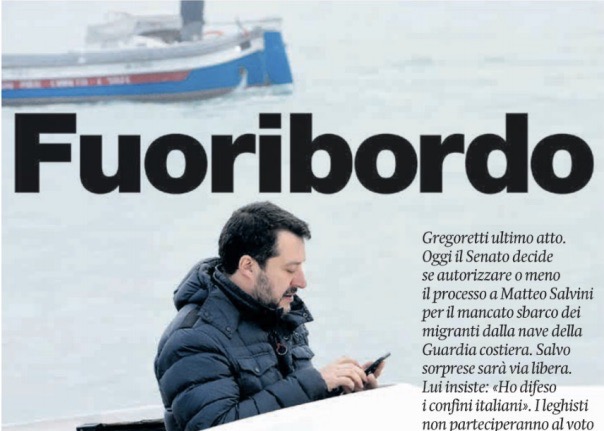 E’ sbagliato solo nella destinazione il “fuoribordo” del solitamente e felicemente immaginifico titolo dedicato dal manifesto all’ex ministro dell’Interno Matteo Salvini per la vicenda della nave Gregoretti. Che -salvo sorprese- costerà al leader leghista il processo in un tribunale ordinario per sequestro addirittura aggravato di persone, per quanto regolarmente soccorse in mare nella scorsa estate e assistite in attesa di distribuzione fra vari paesi europei.