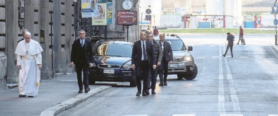 prima alla Madonna, nella Basilica di Santa Maria Maggiore, e poi al Crocifisso venerato dai tempi della peste di cinque secoli fa ed esposto nella Chiesa di San Marcellino al Corso. Che Papa Francesco ha voluto raggiungere a piedi, con la sua scorta, in una Roma disciplinatamente deserta. La foto ha naturalmente e giustamente fatto immediatamente il giro del mondo.
