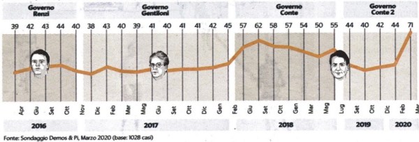Non si impennano solo i dati dei contagiati e dei morti in questa guerra del Coronavirus che ha investito paradossalmente l’Italia più della stessa Cina, da dove si è mosso questo mostro invisibile. Si impennano, a consolazione di Giuseppe Conte e del modo in cui sta fronteggiando l’emergenza, anche i dati di