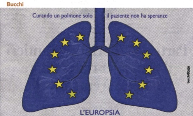 dei giornali e dintorni di amici carissimi e validissimi come Massimo Bucchi. Che ha saputo descrivere ai lettori di Repubblica come meglio non si poteva “l’Europsia” con quei due polmoni -chiamiamoli del Nord e del Sud, dei falchi e delle colombe, dei virtuosi del Baltico e dei meridionali straccioni- minacciati entrambi dal contagio ma uno dei quali soltanto meritevole di soccorso e prevenzione.