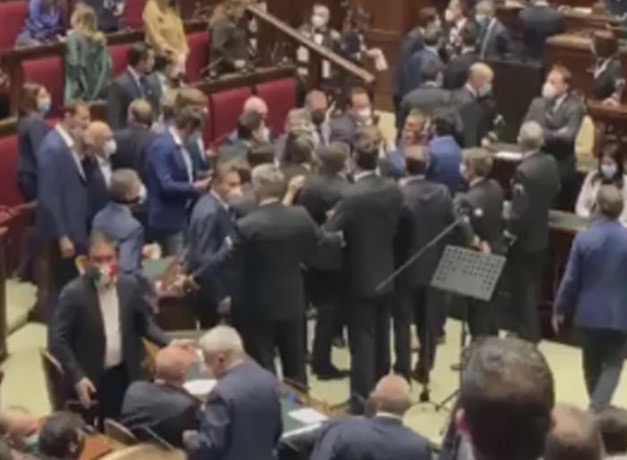 L’effetto del discorso di Ricciardi sul centrodestra, senza distinzioni fra leghisti, fratelli d’Italia e forzisti berlusconiani, é stato dirompente E’ scoppiata in aula una bagarre conclusasi fortunatamente sul piano