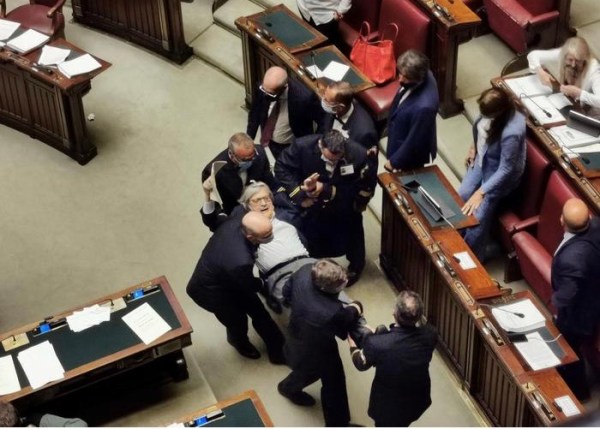 quelle foto dei commessi di Montecitorio che lo sollevano di peso per portarlo fuori dall’aula alla “deposizione di Cristo” dipinta, indifferentemente, dal Caravaggio esposto nei Musei Vaticani o dal Raffaello esposto alla Galleria Borghese.
