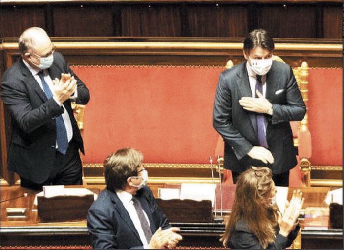 invisi al movimento grillino. “Il Pd-Mes guasta la festa a Conte”, ha titolato con fastidio il giornale più contiano d’Italia, che è Il Fatto Quotidiano, già di cattivo umore per l’intervento a gamba tesa, nell’aula di Palazzo Madama, della presidente notoriamente berlusconiana Maria Elisabetta Alberti Casellati contro i parlamentari che, oltre ad applaudire, fotografavano i colleghi partecipi alla festa e il presidente del Consiglio che ringraziava con la mano sul petto. Egli aveva peraltro già ricevuto una telefonata di apprezzamento da Silvio Berlusconi in persona per il negoziato condotto al vertice europeo di Bruxelles.
