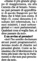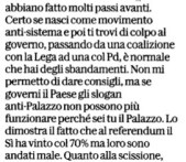Paese, col sottinteso invito pertanto a non fare tutto da solo -o quasi, ripeto- ma a coinvolgere il più possibile le categorie produttive, le regioni, i sindacati -perché no?- e l’opposizione parlamentare. Alla quale nel Senato, peraltro, manca davvero poco per diventare maggioranza, se già non lo è considerando i tormenti fra i grillini, o le alterne impazienze dei renziani.
