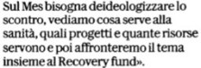 dei grillini a questo tipo di finanziamento. “Sul Mes -ha detto- bisogna deideologizzare lo scontro. Vediamo cosa serve alla sanità, quali progetti e quante risorse servono e poi affronteremo il tema insieme al Recovery fund”, seguendo praticamente il calendario lentissimo di Luigi Di Maio. Che nei rapporti col Pd ha fretta solo di preparare insieme, con candidature comuni o simili, le elezioni comunali del prossimo anno, vista la ingloriosa fine degli accordi tentati a livello regionale.
