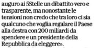 conferma dell’infimo stato di ipocrisia e doppiezza in cui è stata ridotta la politica italiana. E ciò solo per inseguire sotto l’arco del Tito di turno- prima Umberto Bossi, a cavallo tra la prima e la seconda Repubblica, e poi Beppe Grillo- le farfalle della demagogia e del moralismo.