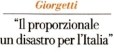 a quelle dell’ex sottosegretario alla presidenza del Consiglio Giorgetti pronunciate nel contesto di un’intervista a Repubblica centrata sul problema di una nuova legge elettorale questa volta interamente proporzionale, in linea di massima concordata fra Pd e Movimento 5 Stelle con una incertezza per ora riguardante solo o soprattutto la cosiddetta soglia di accesso per partecipare alla distribuzione dei seggi parlamentari. E’ una soglia che Giorgetti sospetta sia destinata a scendere via via sotto il 5 per cento originariamente previsto, allo scopo di soddisfare i partiti minori dell’attuale coalizione di governo, a cominciare dall’Italia dei Valori di Matteo Renzi. Che Alessandra Ghisleri ha appena valutato sulla Stampa, in base ai risultati delle elezioni in cui il nuovo partito si è misurato domenica e lunedì scorso, attorno al 3,7 per cento, contro il 5,1 attribuitosi dall’ex presidente del Consiglio.