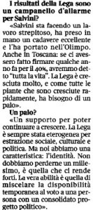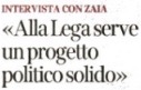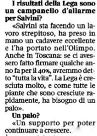 che “alla Lega serve un progetto politico solido”, evidentemente mancante, o non sufficientemente chiaro e visibile. Un progetto che nel testo dell’intervista diventa “un palo”, inteso come “supporto per poter continuare a crescere” e non vanificare “il lavoro strepitoso”, per carità, compiuto da Salvini prendendo “in mano un cadavere eccellente” e portandolo “nell’Olimpo”.