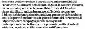 Proprio oggi, e proprio in vista della direzione del suo partito, Violante è tornato sull’argomento in un articolo su Repubblica per ribadire la convinzione e il monito che “la prevedibile vittoria del sì avrà un chiaro significato antiparlamentare difficile da recuperare”, visto che nei progetti grillini ci sono anche il referendum propositivo, finalizzato a contrapporre nelle urne progetti di legge popolari e progetti parlamentari, e l’introduzione del vincolo di mandato, che farebbe del Parlamento, già ridotto nelle sue dimensioni numeriche con sventolamento di forbici anti-casta, anti-sprechi, anti-fannulloni e simili, una suppellettile dei partiti. E di che partiti è facile immaginare e valutare vedendo, fra l’altro, lo stato confusionale del Movimento 5 Stelle.