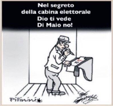 Soprintendenza di Bari,, ha ieri riproposto quel manifesto elettorale di Guareschi agli elettori del referendum odierno lasciando al suo posto Dio -che “ti vede”- e sostituendo il nome di Stalin – che “non ti vede”- col più modesto Luigi Di Maio. Il quale si trova tuttavia nella incredibile situazione di poter fare paura per il peso abnorme che il suo movimento ha guadagnato nelle elezioni politiche del 2018 e conserva nel Parlamento ingessato dopo le sistematiche perdite di voti subite dai grillini ogni volta che si sono poi misurati nelle urne.