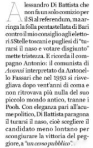 Alessandro Di Battista. Che nel comizio di chiusura della campagna elettorale a Bari a favore della candidata grillina alla presidenza della regione Puglia si è permesso di buttare “nel cesso” l’appello di Travaglio, appunto, al voto cosiddetto disgiunto: a favore del governatore uscente Michele Emiliano, del Pd, e dei candidati consiglieri della concorrente pentastellata Antonella Laricchia. Così dovrebbero fare gli elettori grillini, secondo il direttore del giornale che dà loro consigli per quanto non richiesti, della Toscana: un’altra regione ancora più clamorosamente in bilico nel turno elettorale di oggi e domani per la candidatura di disturbo della pentastellata Irene Grilletti a governatrice.