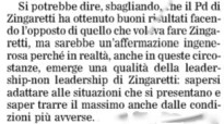ha definito “la leadership-non leadership” di Zingaretti, capace adesso ancor più di prima di “sapersi adattare alle situazioni che si presentano -ha scritto ieri, in particolare, Cerasa- e trarre il massimo anche dalle condizioni più avverse”. Il Tempo si è spinto ancora più in là facendo di Zingaretti un ragno in prima pagina.