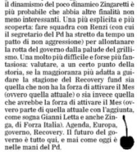 Al Foglio immaginano già il momento in cui sarà possibile “valutare, a un certo punto della storia, se la maggioranza più adatta a guidare la stagione del Recovery fund -ha scritto Cerasa- sia quella che non ha la forza di attivare il Mes, ovvero quella attuale, o sia invece quella che avrebbe la forza di attivare il Mes, ovvero parte di quella attuale con l’aggiunta di Forza Italia, come sognano Gianni Letta e anche Zinga”.