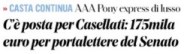il mezzo scandalo da “Casta” di una gara d’appalto indetta per il servizio di distribuzione della posta del Senato con tanto di pony express, pensate un po’,”in giacca e cravatta”. Ah, benedetta signora Presidente.