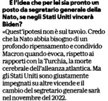 fare meglio dei 5 Stelle e diventare il secondo partito della coalizione”, dopo il Pd, bontà sua. Il solito boy scout, avrà commentato il nuovo editore di Repubblica, chissà se anche a proposito della ipotesi, ritenuta da Renzi soltanto poco attuale, di una sua nomina a segretario generale della Nato “nel novembre 2022”, con un presidente degli Stati Uniti diverso naturalmente da Donald Trump.