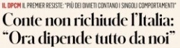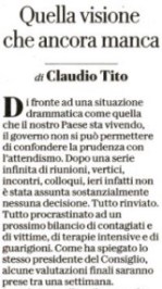si può permettere di confondere la prudenza con l’attendismo”, ha scritto Claudio Tito. Il quale ha aggiunto, dopo avere ricordato la “serie infinita di riunioni, vertici, incontri, colloqui” di Conte e ministri, che “non è stata assunta sostanzialmente nessuna decisione”. “Tutto rinviato, tutto procrastinato ad un prossimo bilancio di contagiati e di vittime, di terapie intensive e di guarigioni”, in attesa di “alcune”, non tutte, “valutazioni finali tra una settimana”, ha concluso in prima pagina l’articolista di Repubblica facendo miracolosamente contento -penserà qualcuno con la solita malizia- sia il vecchio che il nuovo editore del giornale fondato da Eugenio Scalfari.