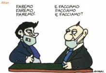 maledettamente “peggio per i fatti”, non per chi ne subirebbe i danni. O si consolerebbero con la vignetta di Nico Pillinini su tutto il globo terracqueo, e non solo l’Italia, soffocato dai tentacoli del Covid, preferendola a quella dell’impertinente Francesco Tullio Altan. Che praticamente denuncia l’attendismo del governo più bello del mondo, che si spende a promettere tanto per il futuro e non fare niente, o quasi, in questo dannatissimo presente.
