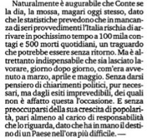 Marcello Sorgi è figlio di un compianto avvocato celebre e validissimo di Palermo, e ne ha probabilmente ereditato la passione, e non solo l’astuzia professionale, nell’arte della difesa, ma temo che questa volta si sia fatta prendere un po’ troppo la mano, pur riconoscendo ogni tanto anche gli “errori” commessi da Conte e i suoi tentativi di rimediarvi.