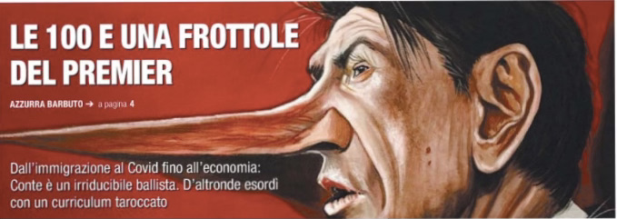 e a dispetto di quei malintenzonati o invidiosi di Libero che proprio oggi gli hanno ulteriormente allungato il naso e proposto ai lettori di centrodestra di ogni tendenza, sovranista o simil-liberale alla Berlusconi, come “il pemier delle 100 e una frottole”.