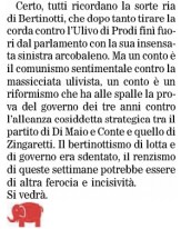 un Renzi sotto sotto deciso anche a provocare davvero le elezioni anticipate che invece esclude a parole, perché ne potrebbe uscire finalmente rafforzato per il logoramento, a dir poco, cui sarebbe destinato il Pd se davvero andasse alle urne alleato con i grillini, un’eventuale lista di Conte e la sinistra dei “liberi e uguali”.