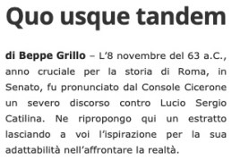 dallo stesso Conte “utili contributi” all’uso dei fondi europei della ripresa, Beppe Grillo sul suo blog personale si è in qualche modo travestito da Cicerone. E ha paragonato Matteo Renzi a Lucio Sergio Catilina, che congiurò contro la Repubblica romana nel 63 avanti Cristo, chiedendogli fino a quando intende abusare della pazienza altrui.
