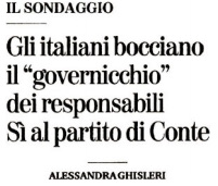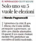 Sera del sondaggio appena effettuato dall’Ipsos di Nando Pagnoncelli. Che ridimensiona alquanto la popolarità di Giuseppe Conte abbassando al 40 per cento il favore alla prosecuzione del suo ormai abborracciato governo e portando l’auspicio di un’”alternativa” ad un altrettanto 40 per cento, per cui si può ben parlare di un paese spaccato a metà.