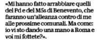 nel governo Conte eventualmente rimpastato, non riescono a capacitarsi: del fatto che Pd e grillini, beneficiari delle terapie di Clemente, vogliano a Benevento impedirne la rielezione a sindaco in primavera. Ingrati che non sono altro.
