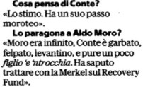 Lo ha conosciuto solo in ottobre del 2019, con De Mita ed altri amici della disciolta Dc, alla commemorazione di Fiorentino Sullo, affidata in un teatro di Avellino proprio a Conte dal presidente dell’omonima fondazione Gianfranco Rotondi, deputato di Forza Italia. Che avrebbe voluto consegnare all’oratore, al termine del discorso, una tessera della Dc se avesse potuto disporne. E Conte sorrise, compiaciuto e disponibile ad altre commemorazioni che potessero