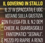 “Il 27 – spiega sempre in prima pagina il giornale di Marco Travaglio- IV (spaccata) e Udc votano sulla giustizia con FI-Lega-FDI. Il n.2 dem chiede al guardasigilli fantomatici “segnali” e mezzo Pd riapre